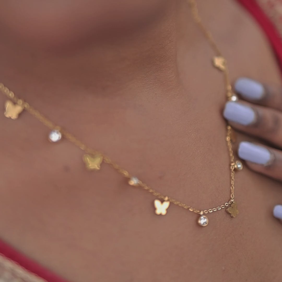 Add a playful yet elegant touch to your look with this butterfly & CZ charm necklace from Zevaae Jewels. Featuring a delicate gold-plated chain adorned with small butterfly charms and shimmering cubic zirconia drops, this necklace is perfect for layering or wearing solo. Crafted from high-quality alloy with a durable gold plating, this artificial jewellery piece is lightweight, skin-friendly, and ideal for everyday wear or gifting.